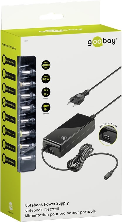 goobay Napájecí zdroj 90W pro notebook 230V, 12-22V max. 4A, USB port