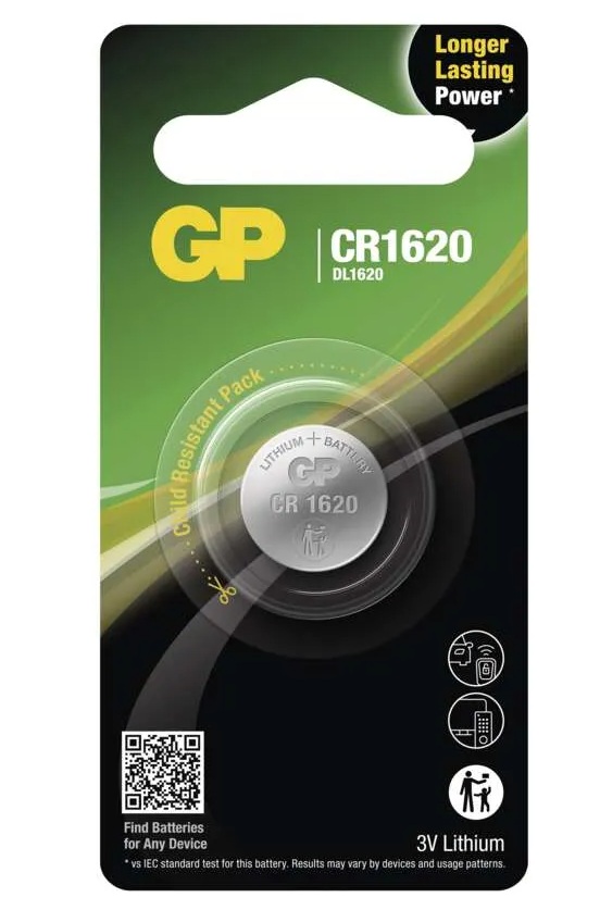 Lithiová baterie CR1620 od společnosti GP má kapacitu 75 mAh a její napětí je 3 V. Tato baterie je určena pro používání v citlivých zařízeních jako jsou například hodinky, tlakoměry, záložní podsvícení, dálkové ovladače a další. Baterii je možné používat v provozních teplotách od -10 °C do +60 °C. Baterii je možné skladovat až 10 let. V balení je dodáván jeden kus této lithiové baterie.