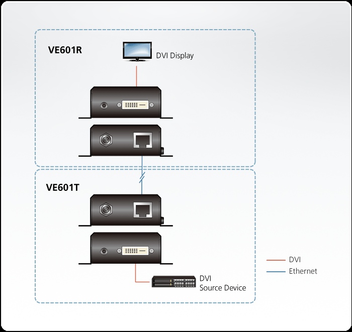 VE601 DVI HDBaseT-Lite Extender je schopný prodloužit DVI signál v rozlišení 1080p až do 70 m při použití kvalitního CAT6A kabelu.