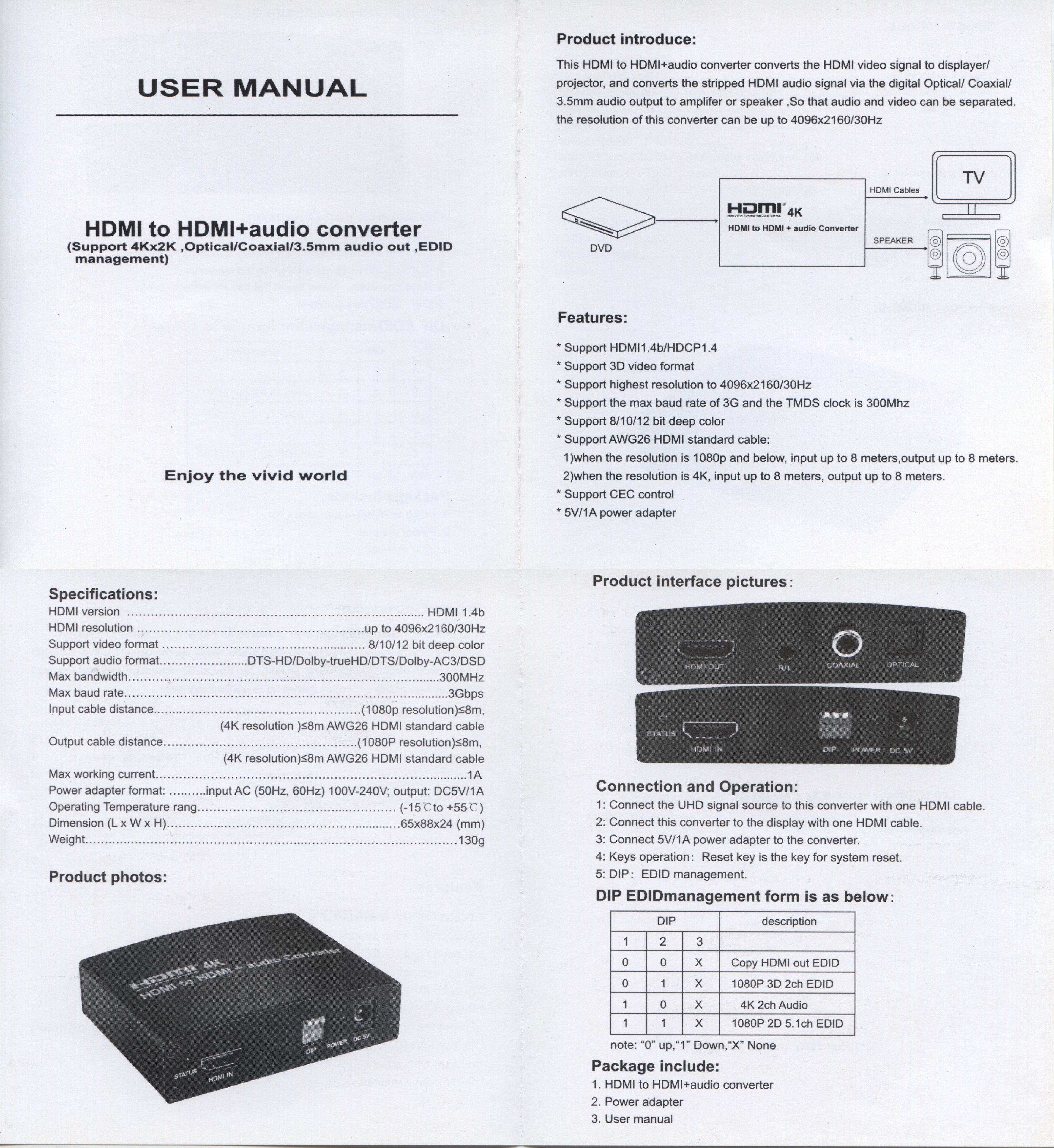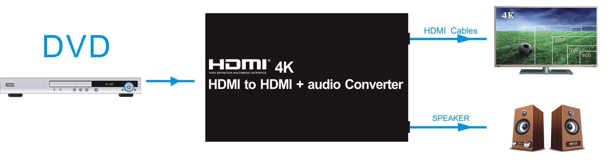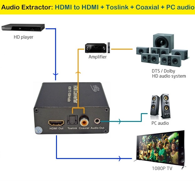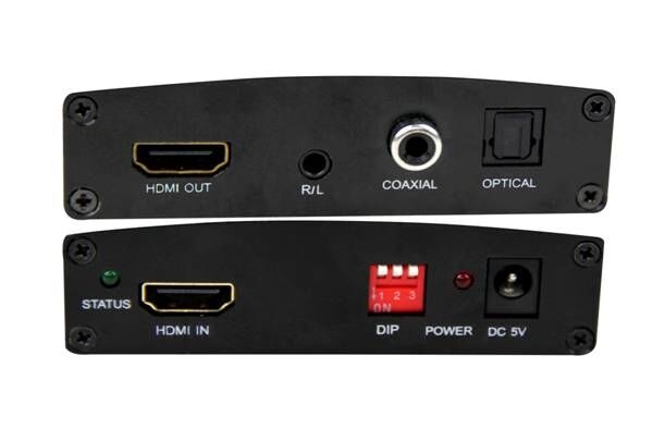 - Vyvede z HDMI audio signál na konektory: stereo jack, Digitální audio RCA CINCH nebo digitální optické TOSLINK (SPDIF)