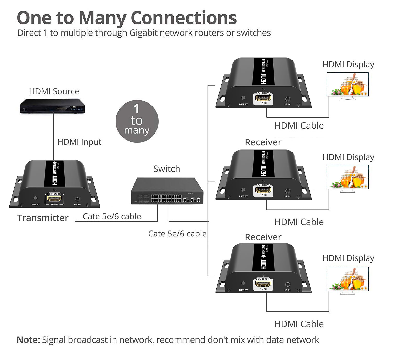 - Extender umožňuje použití jednoho vysílače a více přijímačů vzájemně propojených pomocí LAN sítě, switchů a routerů (otestováno na FULL HD 1080p a 100m kabelu + swich + 2 přijímače) tato počítačová síť musí být vyhrazena pouze pro HDMI extendery, nesmí sdílet další počítače, tiskárny a jiná síťová zařízení.