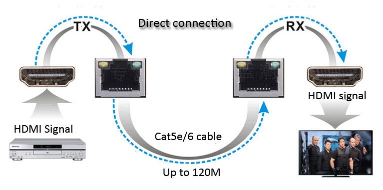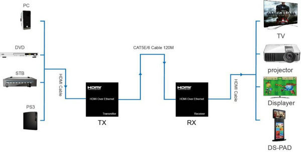 Zařízení umožňuje po jednom síťovém kabelu nebo prostřednictvím LAN sítě přenést HDMI FULL HD signál až na 120m a současně řídící signály IR dálkového ovladače