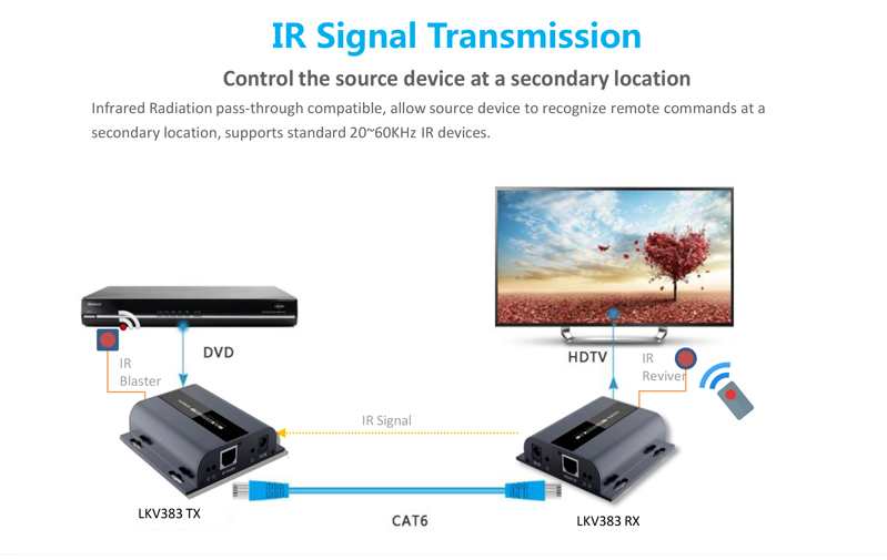 4K HDMI extender na 100m přes Cat5e/Cat6, zařízení umožňuje po jednom síťovém kabelu přenést HDMI signál v rozlišení 4K@30Hz nebo FULL HD 1080p až na 100m.Dále přenáší IR signály pro dálkové ovládání. Vysílač a přijímač má audio výstup pro zesilovač.