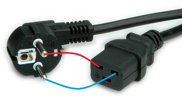 Napájecí kabel v černém provedení pro počítač nebo UPS s konektorem IEC 320 C19 pro 16A . Třížilový kabel je zakončený přístrojovou zástrčkou.