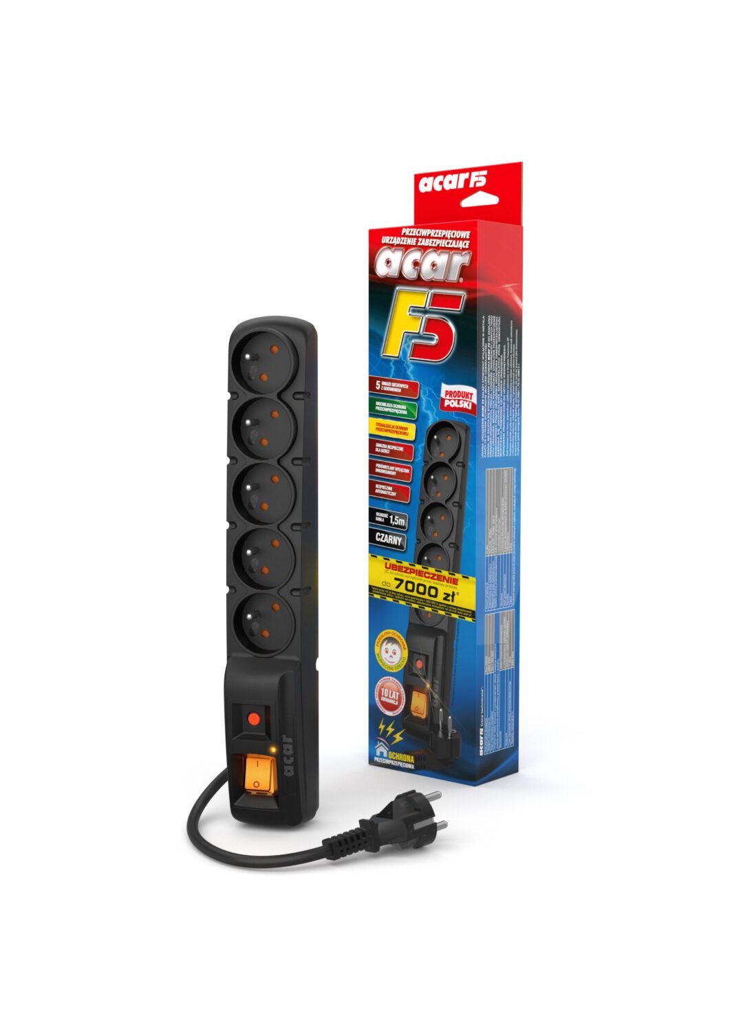 Acar F5 3m kabel, 5 zásuvek, přepěťová ochrana, černý
