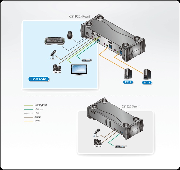 Aten CS1922 2-port 4K DisplayPort KVMP 3.0 přepínač umožní jednomu uživateli sdílet dva připojené počítače za pomocí jedné klávesnice, myši a monitoru.