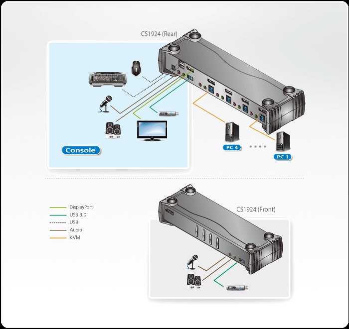 Aten CS1924 4-port 4K DisplayPort KVMP 3.0 přepínač umožní jednomu uživateli sdílet čtyři připojené počítače za pomocí jedné klávesnice, myši a monitoru.