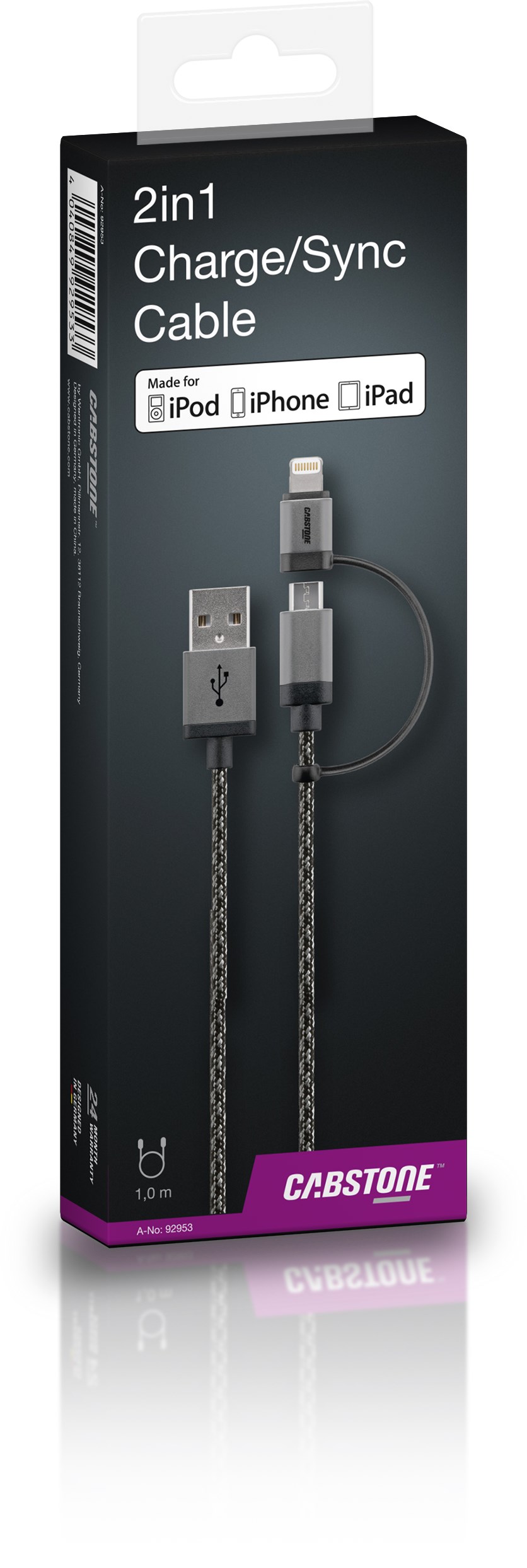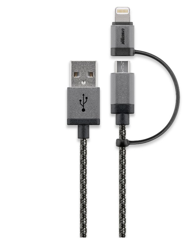 CABSTONE Lightning iPhone nabíjecí a synchronizační kabel 2v1, opletený, černo-stříbrný, 8pin + micro - USB A M/M, 1m