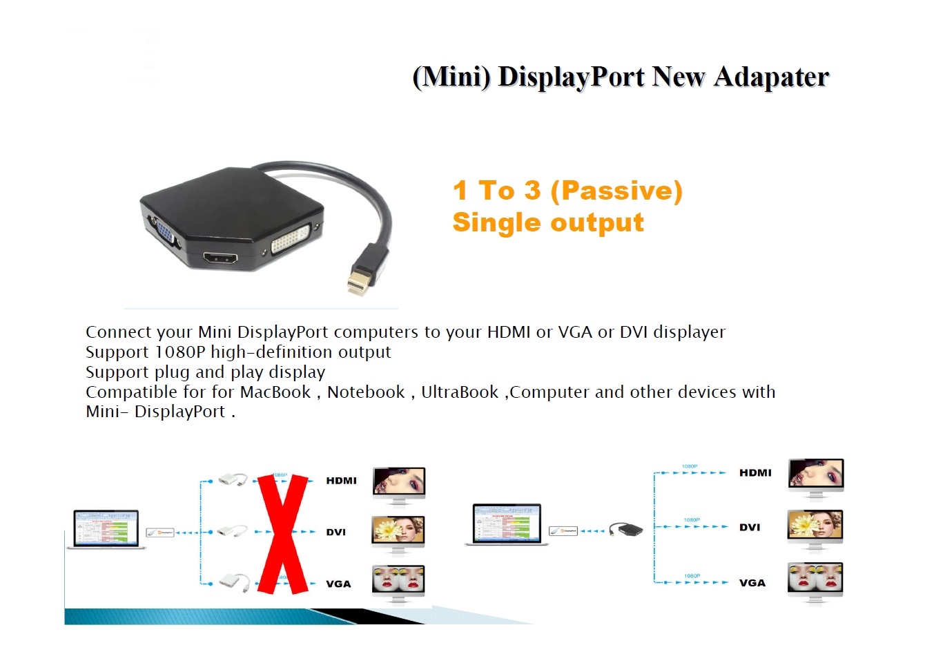 Tento adaptér umožňuje propojit DisplayPort výstup s LCD nebo televizí s HDMI, DVI nebo VGA vstupem