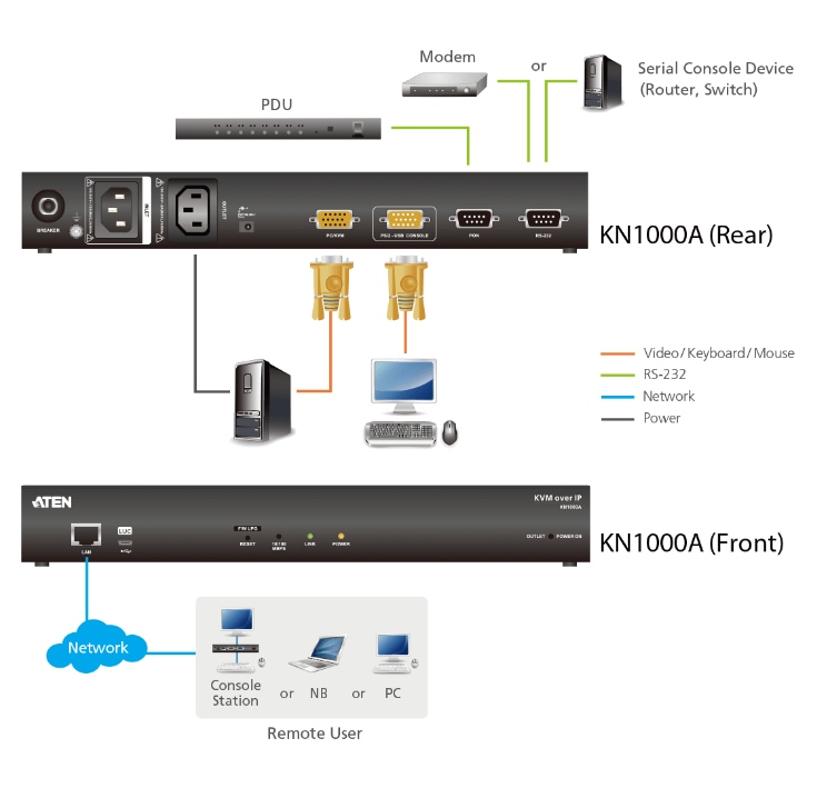 Zařízení umožňuje po internetu/intranetu s portem RJ45 (over IP) ovládat připojený počítač nebo KVM přepínač, modem (na portu RS-232), ovládat napájení připojené jednotky přes PDU port (umožňuje funkce PON). Umožňuje spravovat počítač buď přes grafického klienta JAVA/ nebo Windows GUI i na úrovni BIOSu připojeného počítače. Na přepínači je i port LUC pro připojení laptopu. Vylepšené rozlišení obrazu až 1920 x 1200 @ 60Hz.