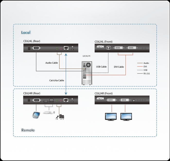 Aten CE624 USB DVI Dual View HDBaseT ™ 2.0 KVM Extender integruje nejnovější HDBaseT ™ 2.0 technologie a poskytuje nejspolehlivější přenos videa, audia, USB a RS-232 signálů na trhu. CE624 poskytuje vysoce kvalitní DVI Dual View video, PCM 2-kanálový digitální zvuk, USB 2.0 a RS-232 signály do 100 metrů od zdrojového počítače pomocí jediné CAT6 / 6a kabelu. CE624 je ideální pro aplikace, kde je vyžadován pohodlný vzdálený přístup - v místech, jako je kontrola dopravy center, zdravotnických zařízení, průmyslových skladech a rozšířených pracovních stanic.