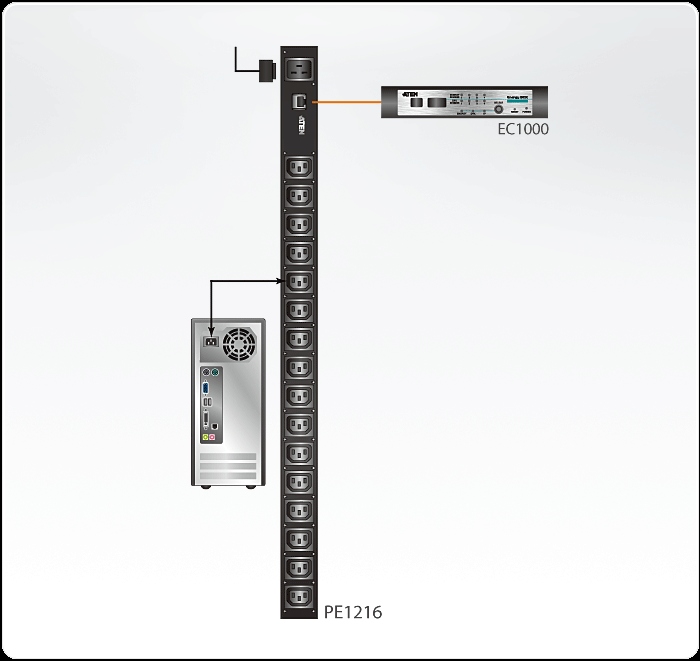 PE1216 Energy PDU může být integrován do zařízení s EC-1000 Energy Box, která vám umožní sledovat v reálném čase proud a environmentální podmínky energetického PDU z předního panelu EC-1000, nebo přes webové rozhraní na dálku - aby vaše serverové místnosti.