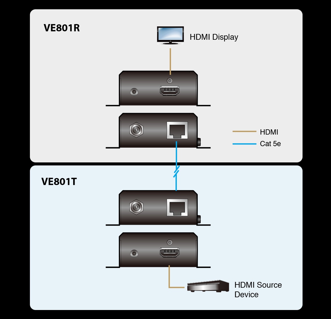 VE801 Aten HDMI HDBaseT-Lite Extender umožňuje prodloužení videosignálu HDMI na vzdálenost až 70m. Zařízení podporuje technologii HDBaseT-Lite. Pro spojení jednotek se používá