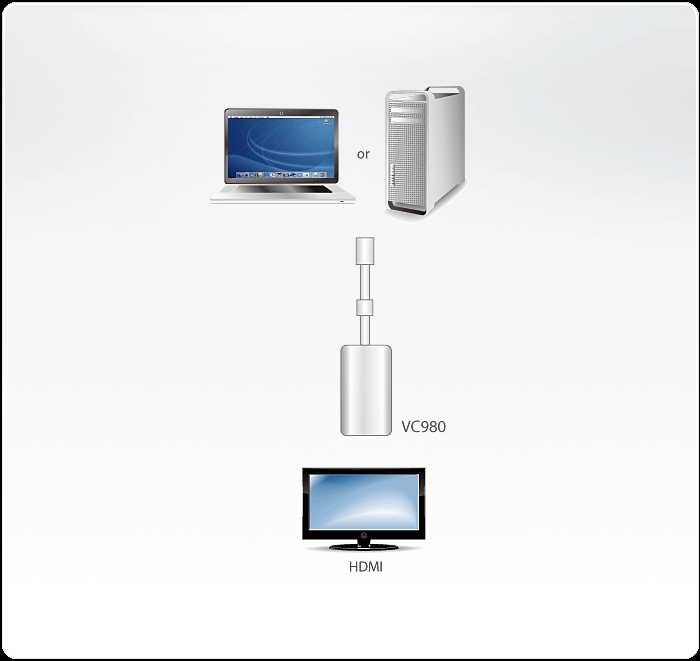VC-980 je MiniDisplayPort na HDMI adaptér, který umožňuje připojení MiniDisplayPort výstup ze zařízení do vstupu HDMI FullHD 1080p televizoru nebo jiného displeje.