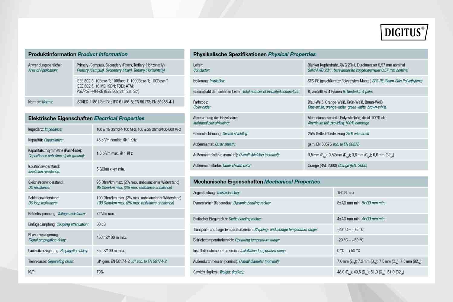 DIGITUS CAT 7, orange 100m ring, Twisted Pair PiMF Installation CableS/FTP, AWG 23/1, LSZH, 1000MHz