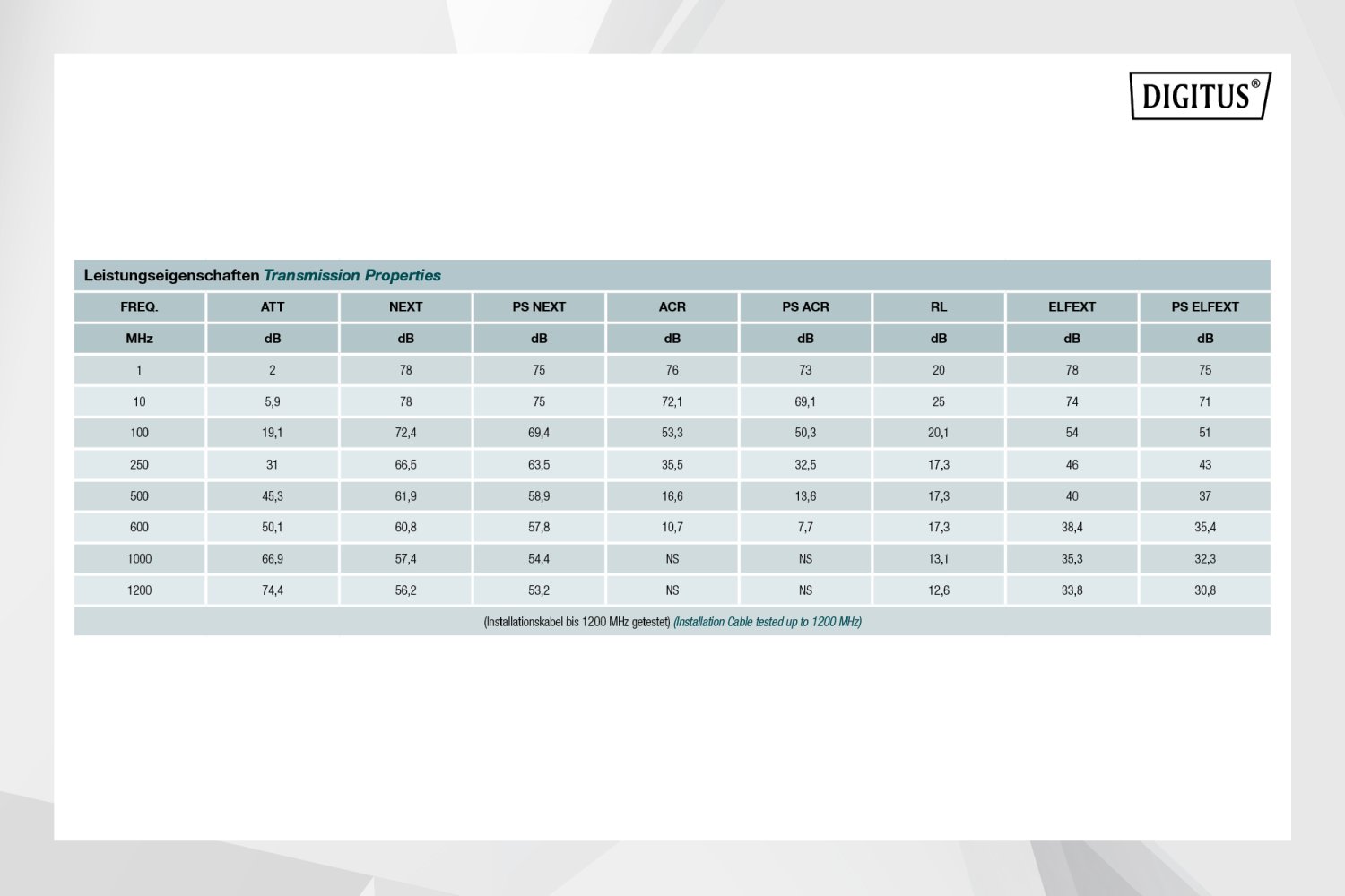 • PS-ANEXT loss: 92.5-15Log(f) dB min. @ 1-600 MHz (67 dB max.)