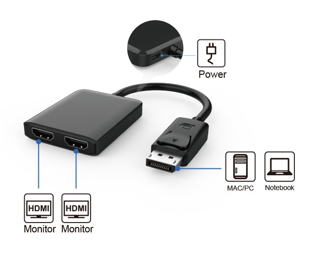 Tento adaptér umožňuje propojit DisplayPort výstup se dvěmi HDMI monitory a na každém zobrazovat jiný obraz.Například se dá využít k vytvoření rozšířené plochy na dvou monitorech viz fotografie v příloze jako příklad použití.