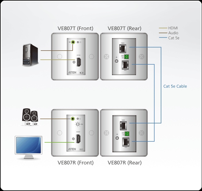 Zařízení se propojuje dvěmi Cat5E kabely s RJ45 konektory mezi jednotkami (není součástí, nesmí být zapojen do živé sítě).