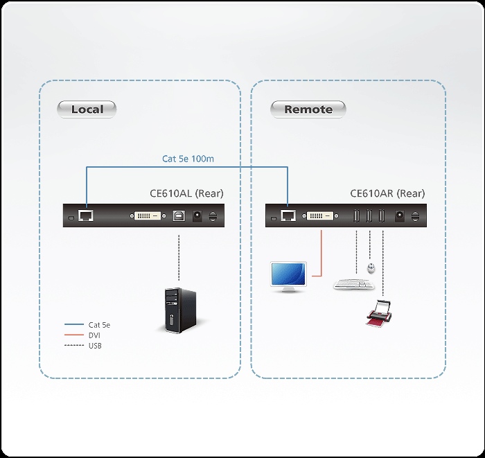 Podpora rozlišení DVI monitoru až 1920 x 1200 @ 60 Hz do 100 m. Zařízení se propojuje 1xCat5E kabelem s RJ45 konektory mezi jednotkami (není součástí, nesmí být zapojen do živé sítě).