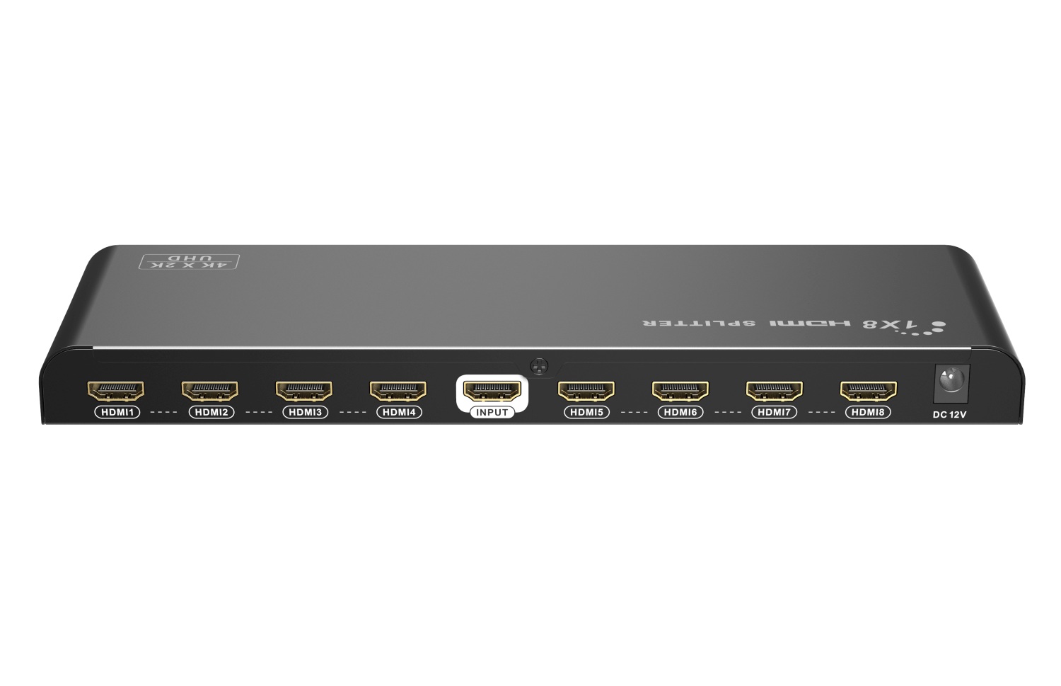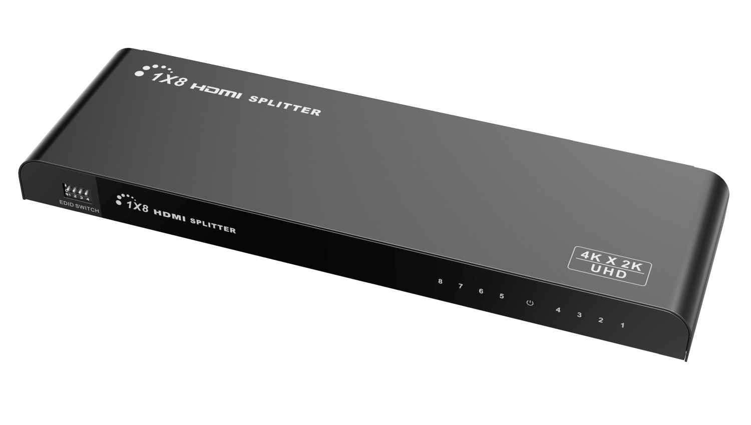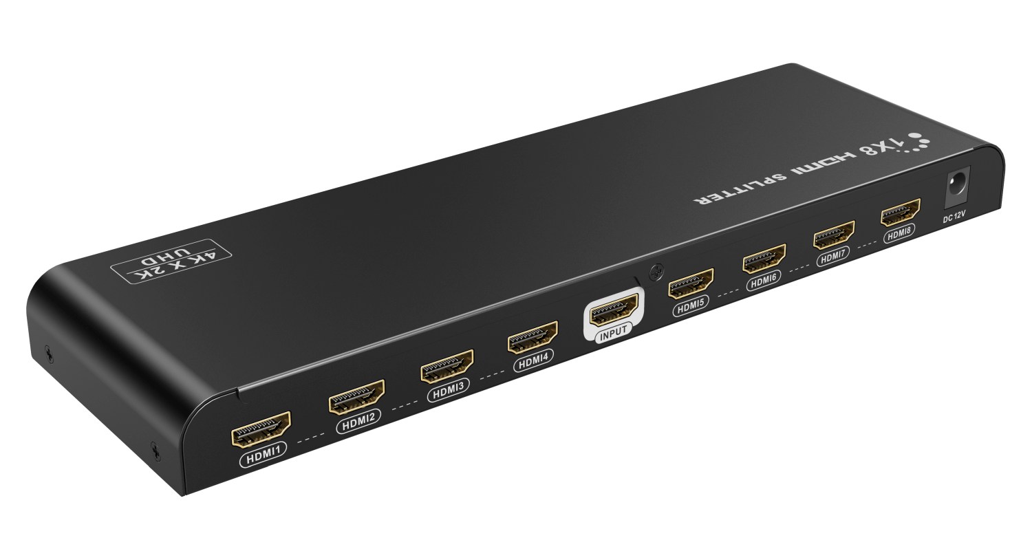 - Splitter obsahuje aktivní zesilovač signálu, který umožňuje zapojit za splitter kabely až do délky 8m. Kabely musí mít kvalitní měděné vodiče a dostatečný průřez vodičů vzhledem k délce kabelu a použitému rozlišení video signálu