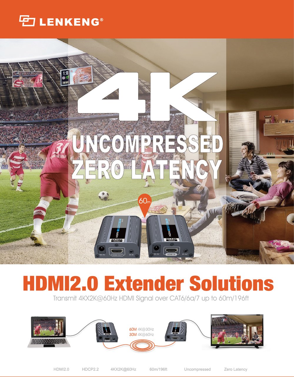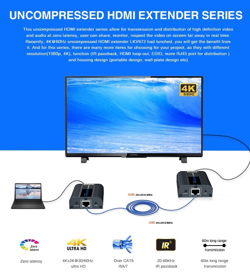 Zařízení umožňuje po jednom kvalitním síťovém kabelu přenést 4Kx2K@60Hz na 30m nebo 4Kx2K@30Hz a FULL HD signál až na 60m.