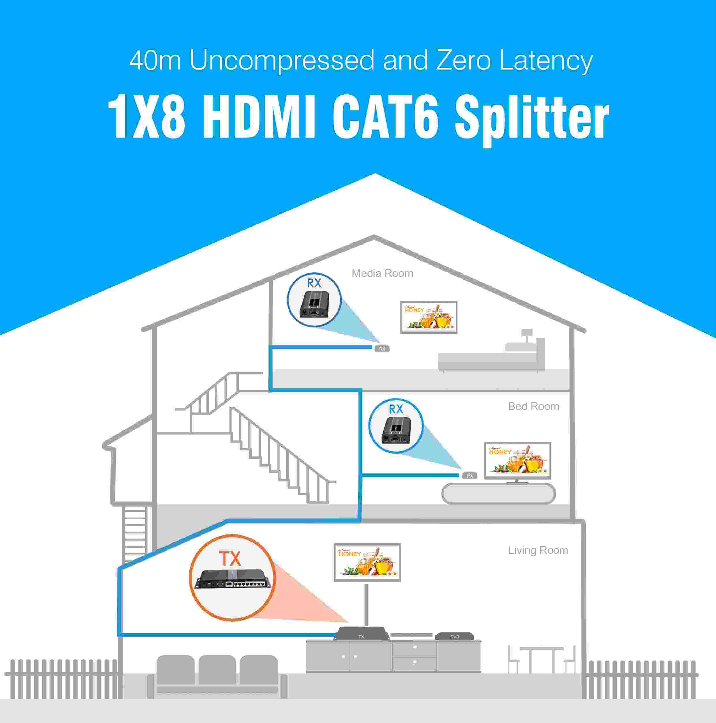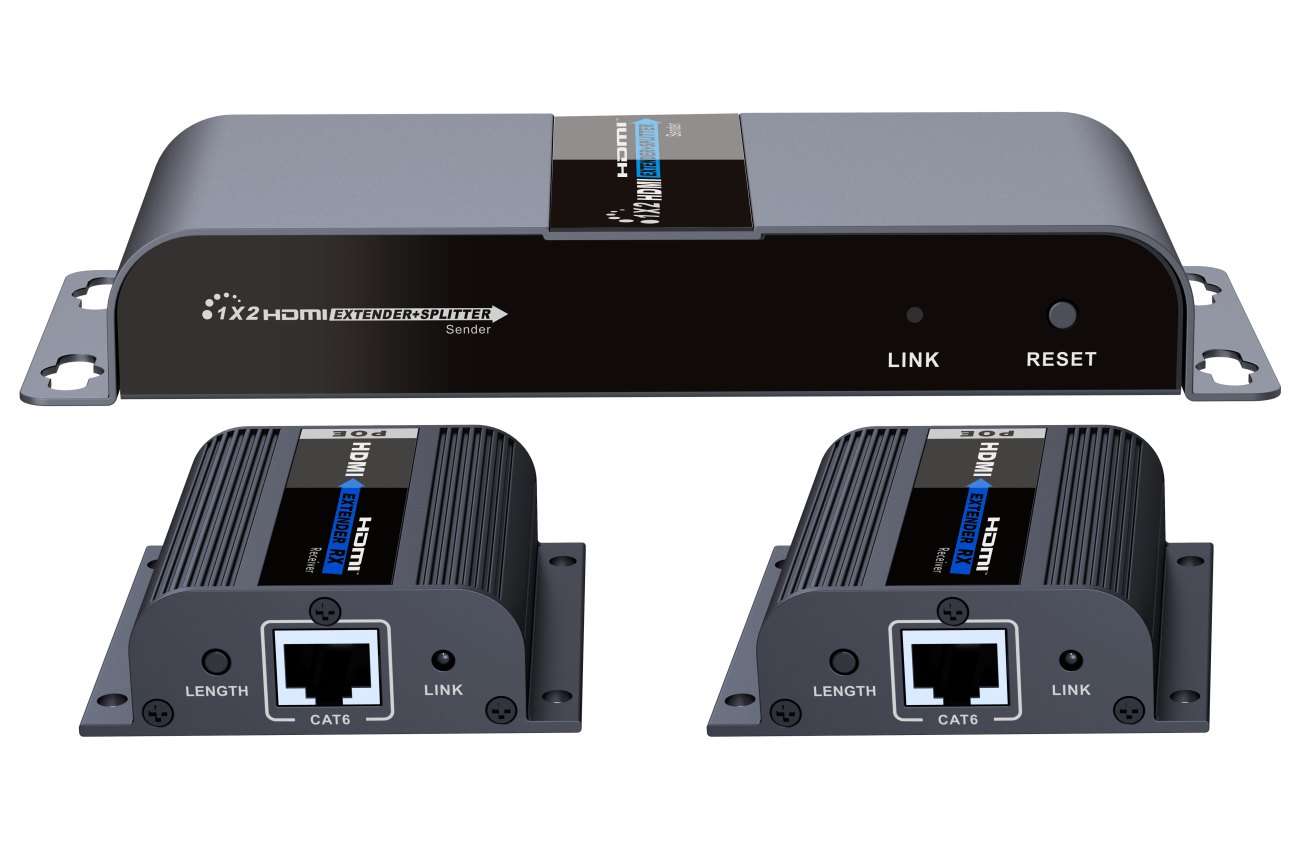 Extender se skládá z jedné vysílací jednotky s lokálním výstupem HDMI a dvou přijímačů, které se propojí CAT6/6a/7 kabelem s vysílačem.