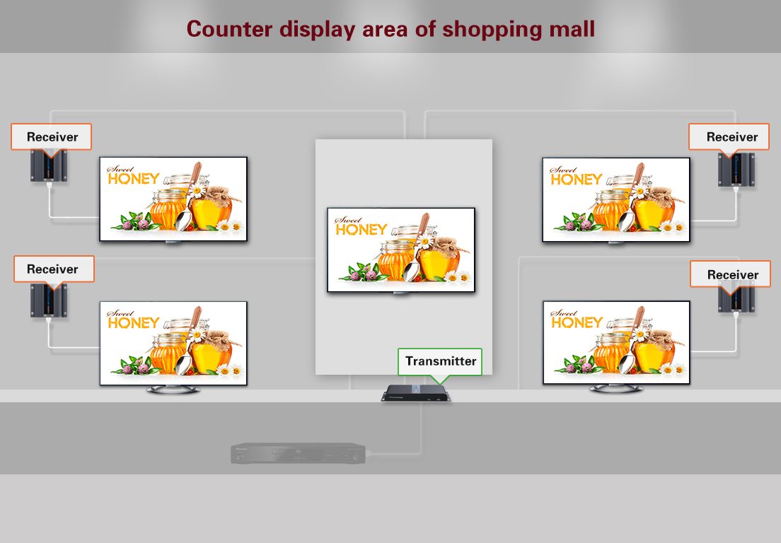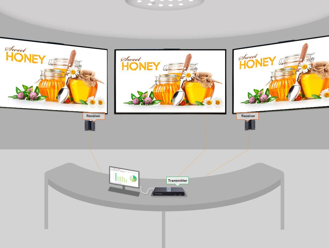 Můžete připojit několik HDMI obrazovek k jednomu HDMI zdroji signálu po kabelu CAT6/6a/7,