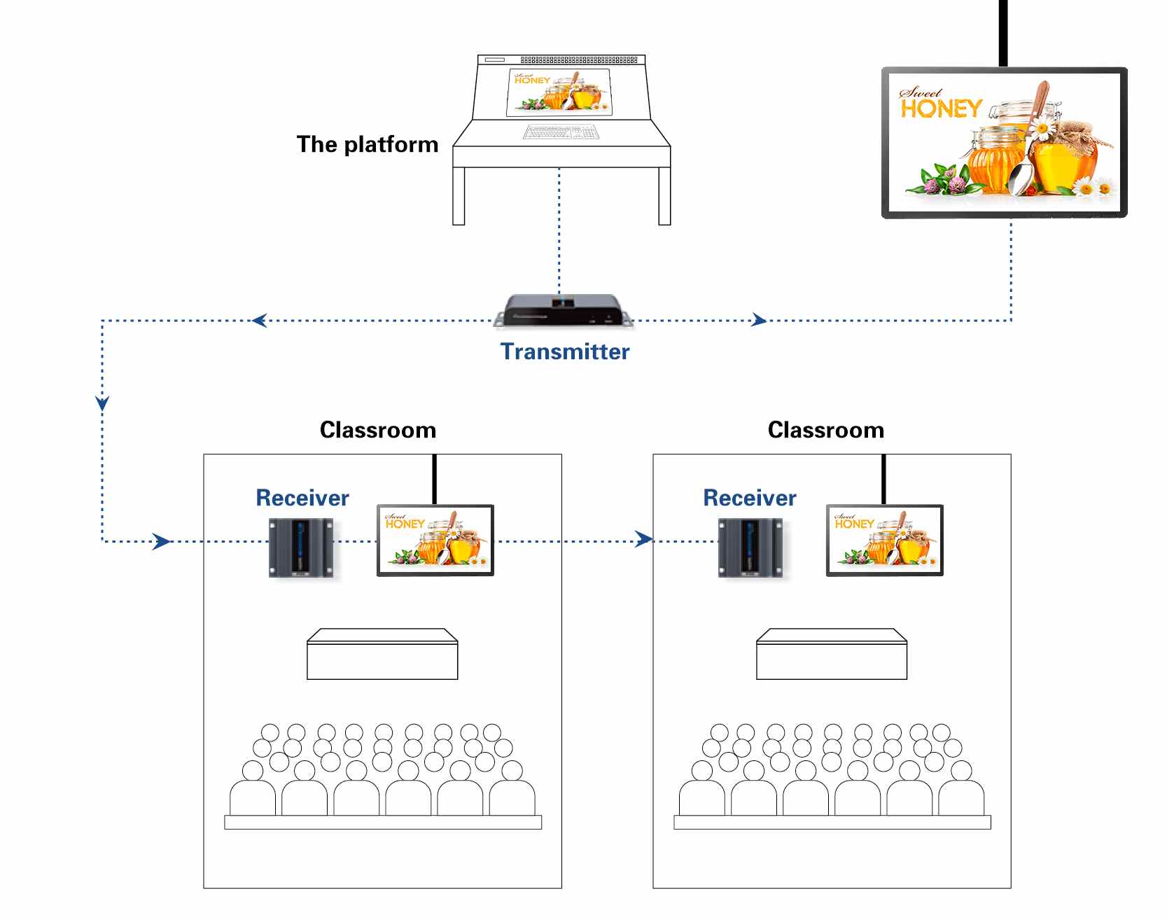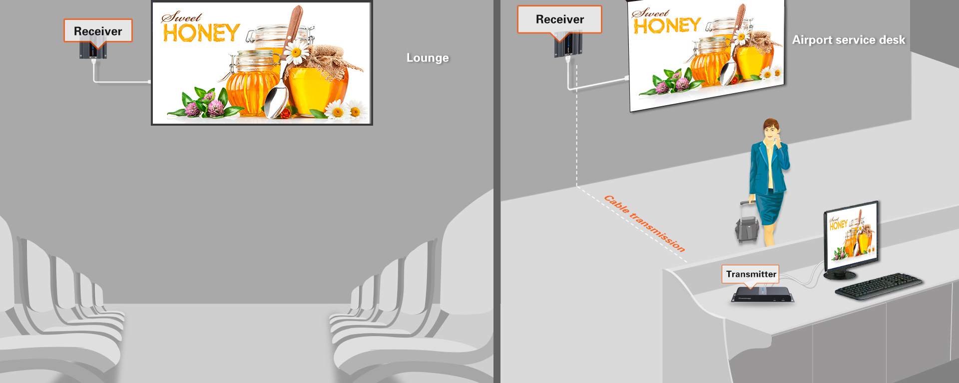 - Výstupy: 1x lokální výstup HDMI a vysílači, 2 x HDMI výstupy (Type A) na přijímačích