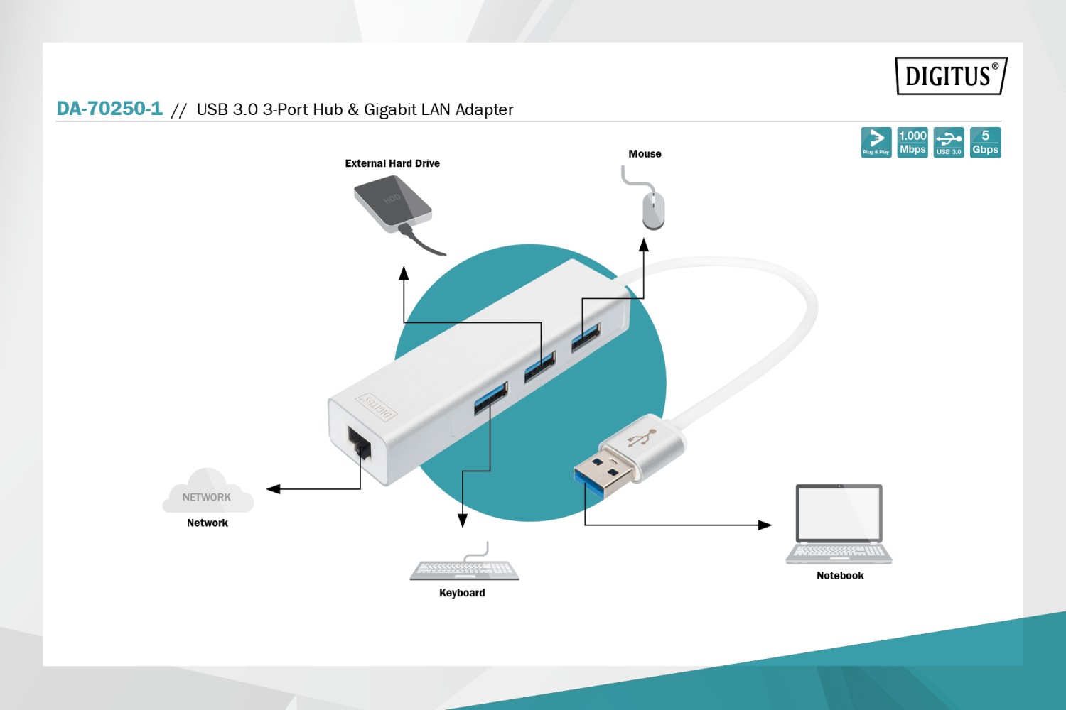 K DIGITUS® USB 3.0 Hub a gigabitový LAN adaptér můžete připojit další 3 USB 3.0 vysokorychlostní zařízení k Ultrabooku, notebooku, subnotebooku, Macbooku, MacBooku Air atd. tiskárny, pevné disky, flash paměť, čtečku karet, reproduktory a mnoho dalších zařízení.