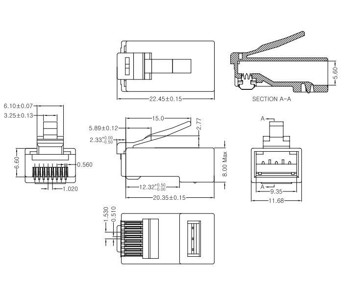 Konektor RJ45 8pinů Cat6A - pro montáž bez nástroje a kleští pro drátové a lankové vodiče AWG 22-26