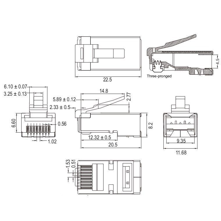 Konektor RJ45 nestíněný CAT6 krimpovací pro kulaté kabely, RJ45 8P8C 8 pinů, nestíněný konektor, vhodné na lanko a drát Cat6,a 2 x prong