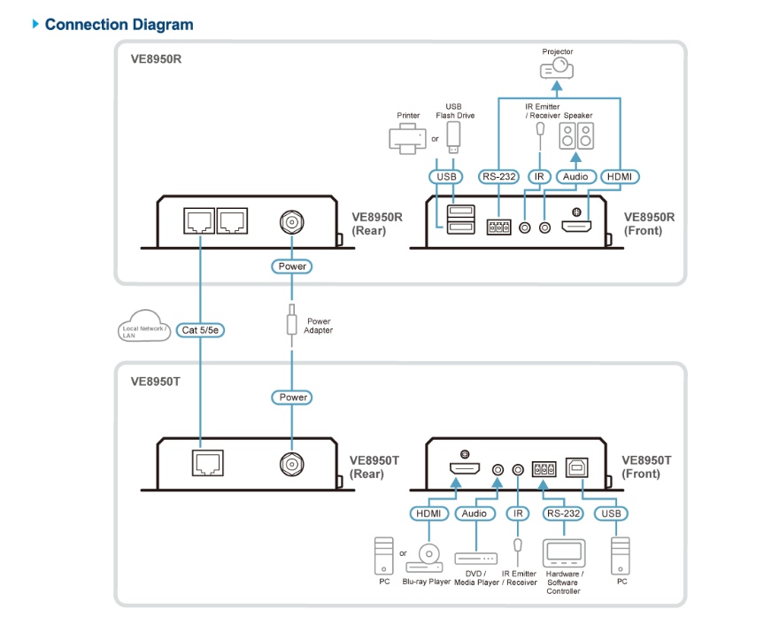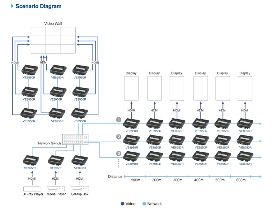 VE8950 poskytuje efektivní, snadno použitelné a ekonomické řešení digitálního systému s následujícími funkcemi a výhodami, které přímo reagují na problémy, se kterými se integrátoři setkávají při zavádění systémů AV přes IP: