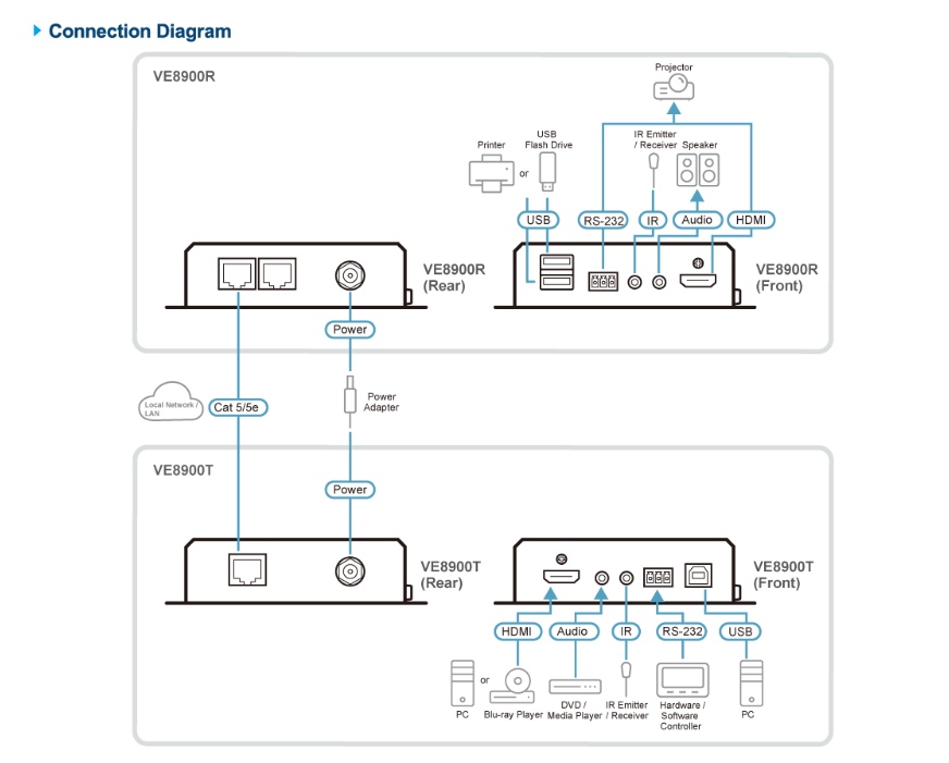Přístroj ATEN VE8900 Video over IP Extender poskytuje vizuálně bezztrátový 1080p AV signál s nízkou latencí na dlouhé vzdálenosti prostřednictvím standardní počítačové sítě a kabelů RJ45.