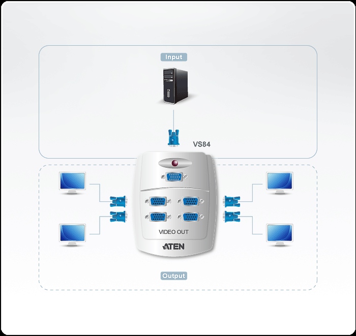 VS84 Video Splitter duplikuje video signál ze vstupního zdroje (tj. počítače) a směruje jej až na 4 zobrazovací zařízení (monitory, projektory atd.). Překračují však pouhé duplikátory v tom, že také zesilují video signály na vzdálenost až 30 metrů. Kromě toho je lze kaskádovat ve třech úrovních k dalším rozbočovačům videa ATEN pro podporu mnoha četných zobrazovacích zařízení. A montují se nenápadně na zeď nebo z dohledu.