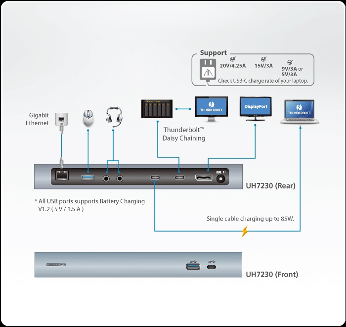 Gigabitový port Ethernet dodává Internet rychlostí až jednoho Gigabitu (1000 Mb/s). Tato multiport dokovací stanice také podporuje USB Power Delivery 2.0, což znamená, že UH7230 může