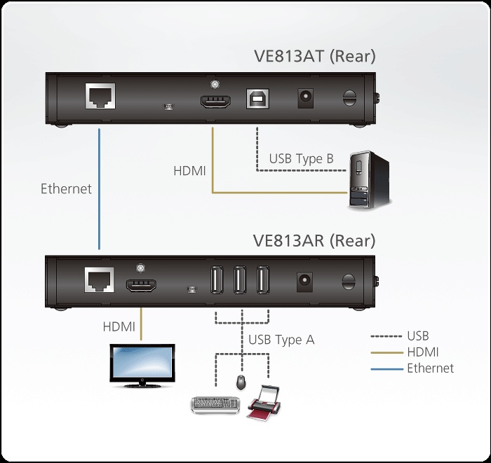 VE813 Aten HDMI HDBaseT Extender umožňuje prodloužení videosignálu HDMI a USB na vzdálenost až 100m. Zařízení podporuje technologii HDBaseT a Extreme USB. Pro spojení jednotek se používá