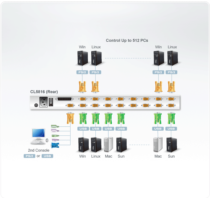 CL5816 podporuje klávesnice a myši PS / 2 a USB pro připojené počítače a CL5816 podporuje periferní zařízení USB, která mají být použita s připojenými počítači. Jeden CL5816 může ovládat až 16 počítačů. Až 31 dalších kompatibilních přepínačů KVM může být spojeno dohromady, takže je možné ovládat až 512 počítačů z jediné konzoly klávesnice, monitoru a myši.