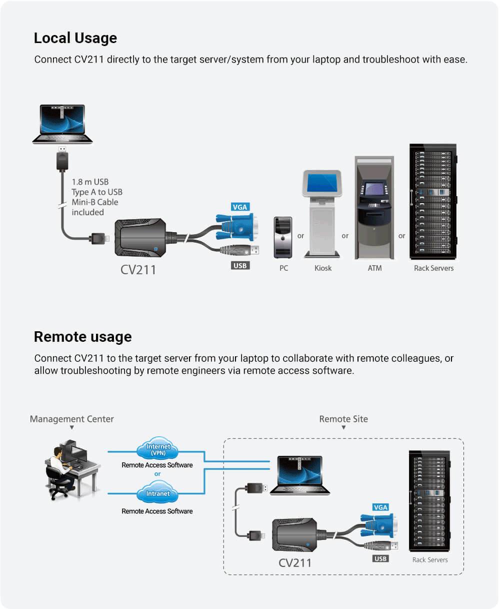 "Proměňte svůj notebook na mobilní konzoli během několika sekund." CV211 USB adaptér umožňuje přímé připojení notebooku k počítači pro rychlý a snadný vzdálený přístup k desktopu bez potřeby instalovat jakýkoliv software. Vysoce účelný a kompaktní design zařízení. Zařízení nabízí obousměrné přenosy souborů, hotkey makra, nahrávání videa a screenshoty prostřednictvím USB 2.0 a VGA kabelu.