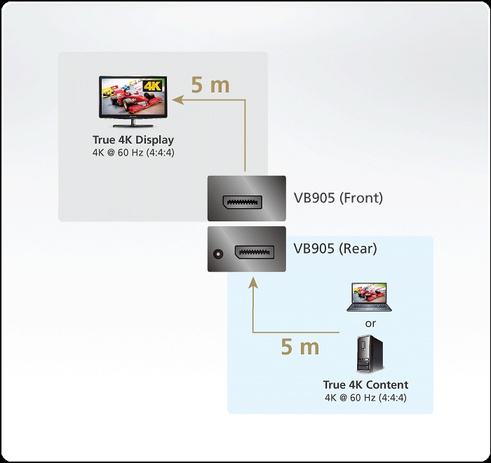 ATEN VB905 prodlužuje signál True 4K ze zdrojového zařízení na displej až do 5 metrů. Pro dálkový přenos může být VB-905 kaskádován až do 3 úrovní (20 metrů),