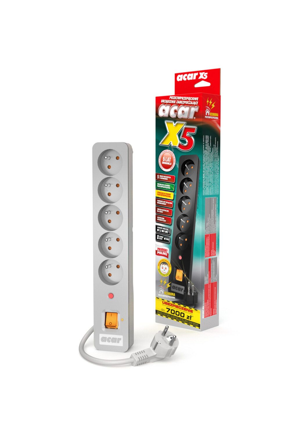 Acar X5 je jedna z nejnovějších přepěťových ochran prodávaných pod značkou Acar. Spolehlivost, efektivní konstrukční řešení a moderní design definují Acar X5. Lesklý povrch zdůrazňuje jedinečnost a svěží vzhled výrobku, což z něj činí vizuální potěšení pro oči. Pět zásuvek a malá velikost zařízení jej dělá užitečným jak doma, tak v kanceláři. Automatická pojistka zajišťuje praktický a bezúdržbový provoz. Vysoká účinnost a atraktivní vzhled předurčují