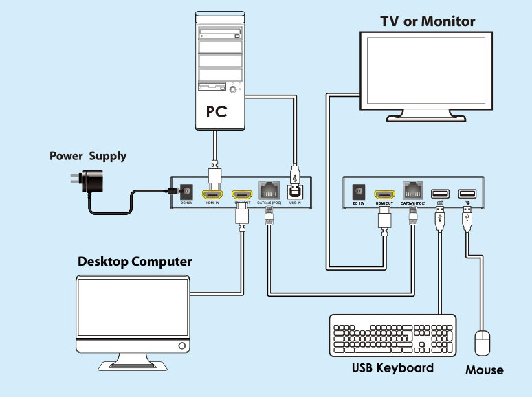 - Vysílač má jeden vstupní HDMI konektor a jeden lokální HDMI výstup. Přijímač má jeden HDMI výstup pro vzdálená monitor.