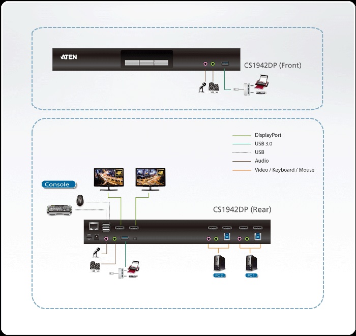 Přepínač KVM ATEN CS1942DP pomáhá organizovat pracovní plochu. Zvláště při správě multimediální pracovní stanice ve velké organizaci nabízí CS1942DP uživatelům okamžitý přístup ke dvěma počítačům,