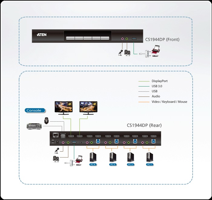 Přepínač KVM ATEN CS1944DP pomáhá organizovat pracovní plochu. Zvláště při správě multimediální pracovní stanice ve velké organizaci nabízí CS1944DP uživatelům okamžitý přístup ke čtyřem počítačům,