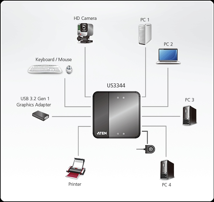 ATEN US3344 je 4-portové USB 3.1 Gen1 zařízení pro sdílení periferií, které umožňuje uživatelům sdílet až čtyři USB zařízení mezi 4 různými běžnými počítači pomocí kabelů USB 3.1 Gen 1 Type-B na typ A.