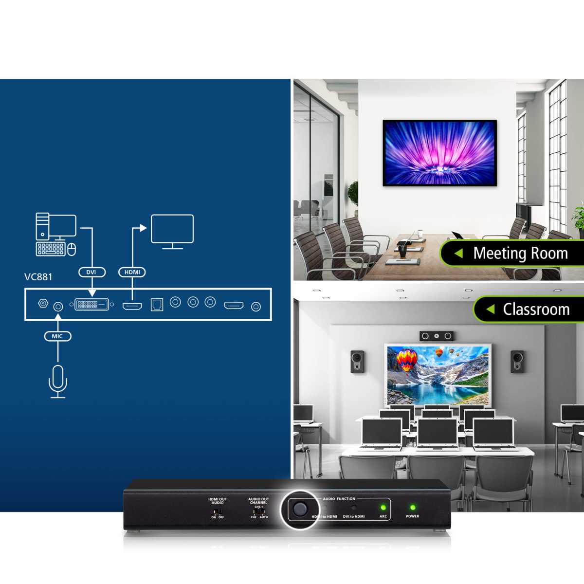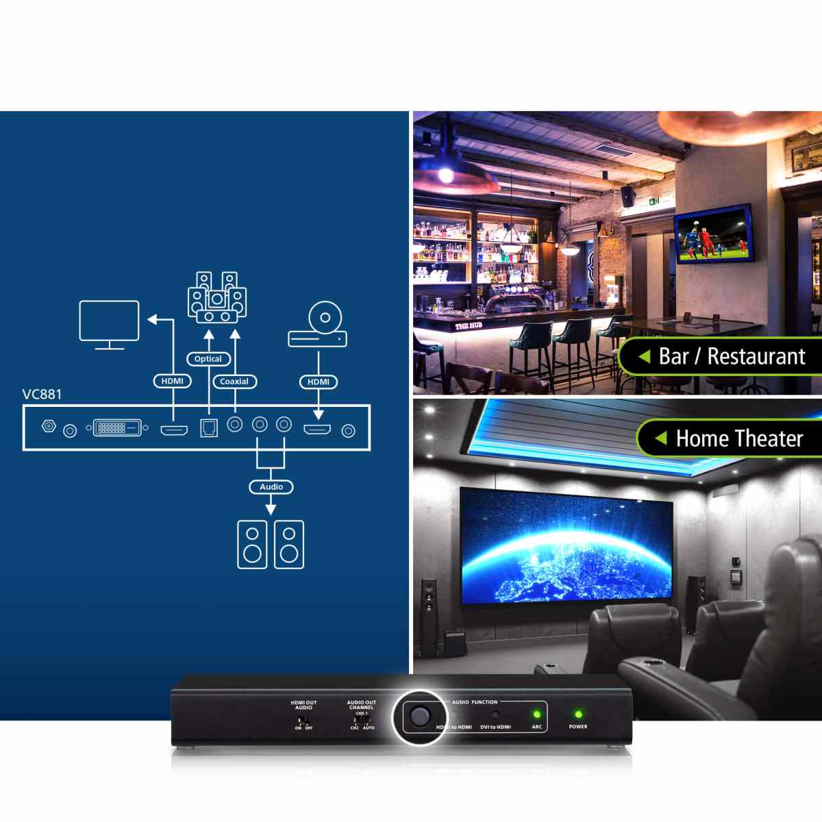 VC881 nabízí flexibilitu pro podporu konverze signálového rozhraní (DVI na HDMI) a oddělení audia z HDMI. VC881 rozděluje zvuk z videa HDMI na funkci dekomprese zvuku HDMI