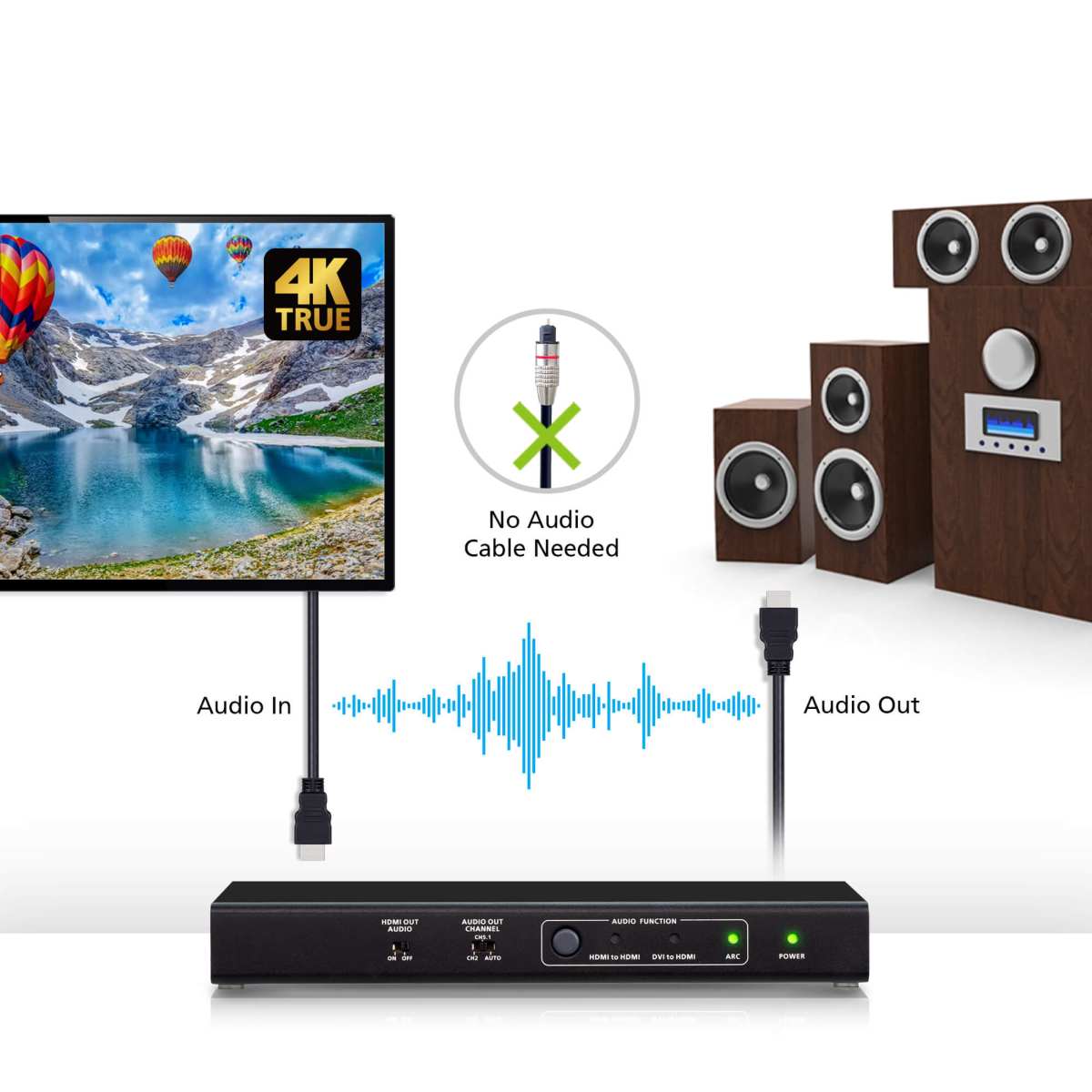 a převede jej na signál S / PDIF, koaxiální nebo RCA stereo audio, aby podporoval zvukový systém, který je oddělený od displeje. Umožňuje to, aby video HDMI pokračovalo na displeji během dodávání zvuku