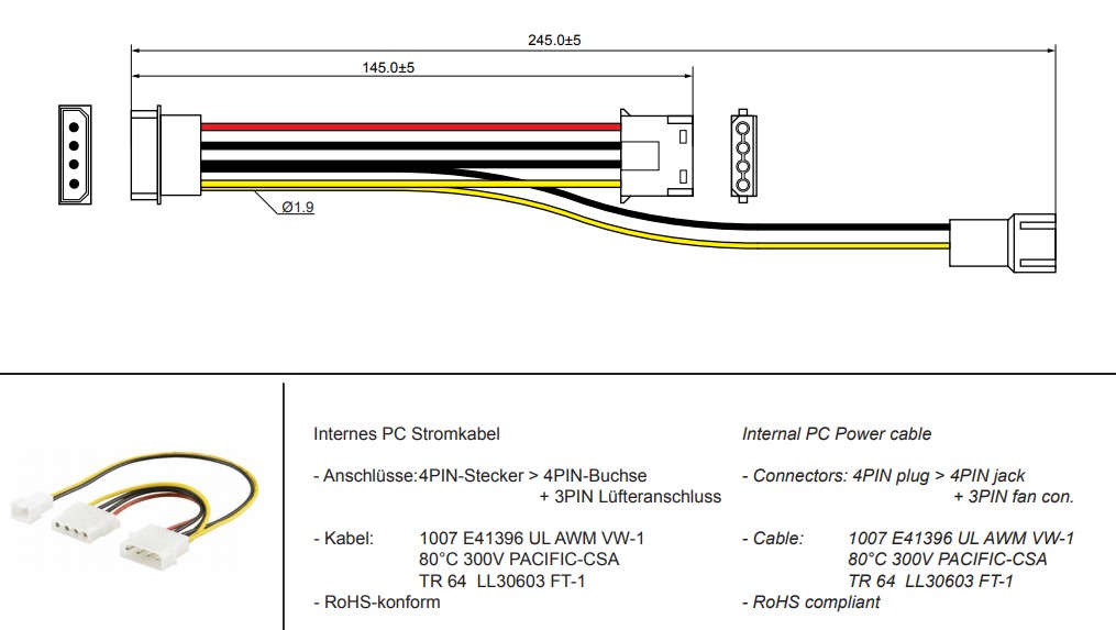 - Pro připojení ventilátoru počítače a připojení napájení 5.25", např. pro pevné disky, jednotky pevného disku, disky CD-ROM / DVD / BluRay - Délka kabelu 25cm