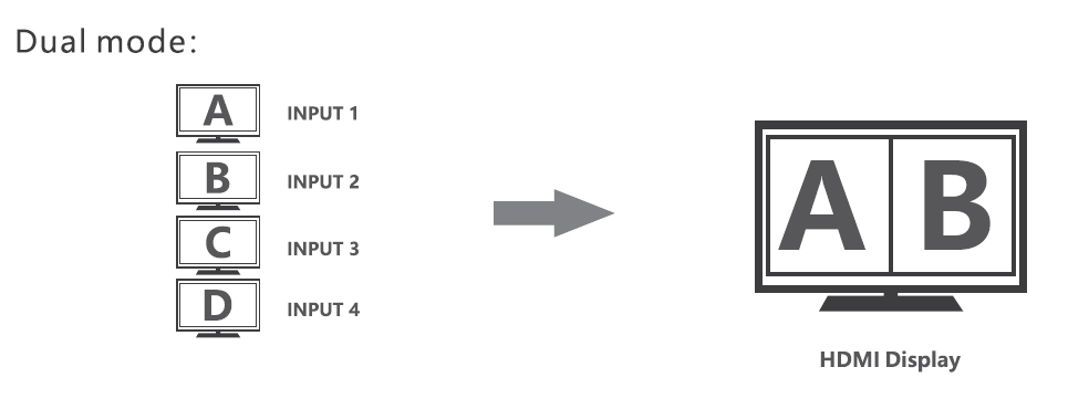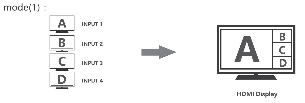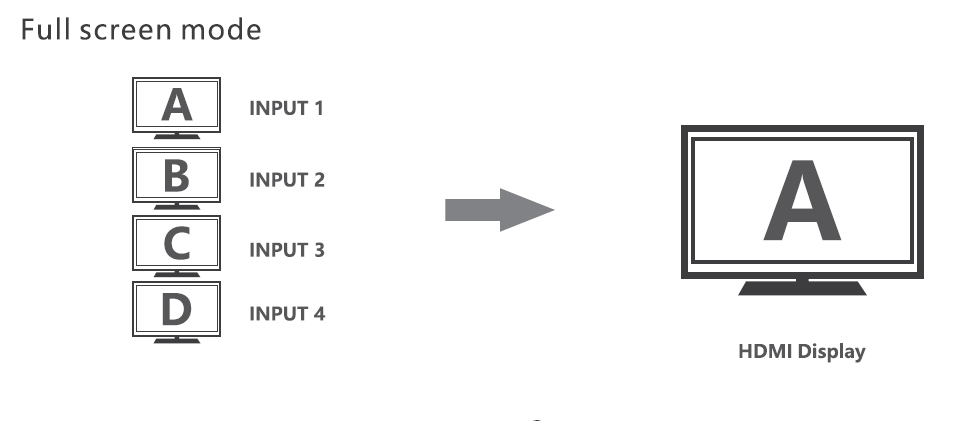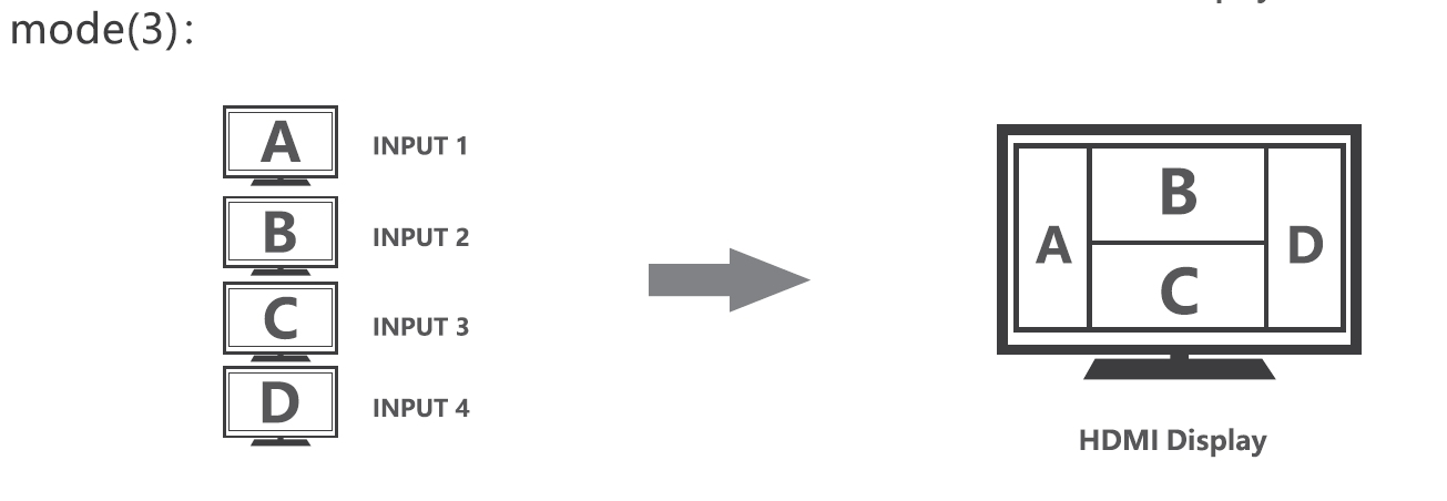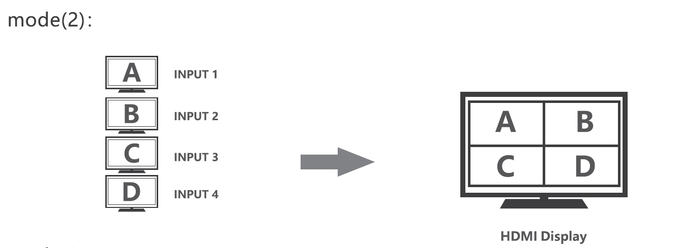 - Umožňuje zobrazit jednotlivé čtyři HDMI signály (čtyři obrazy) na jedenom výstupu HDMI (na jednom monitoru).