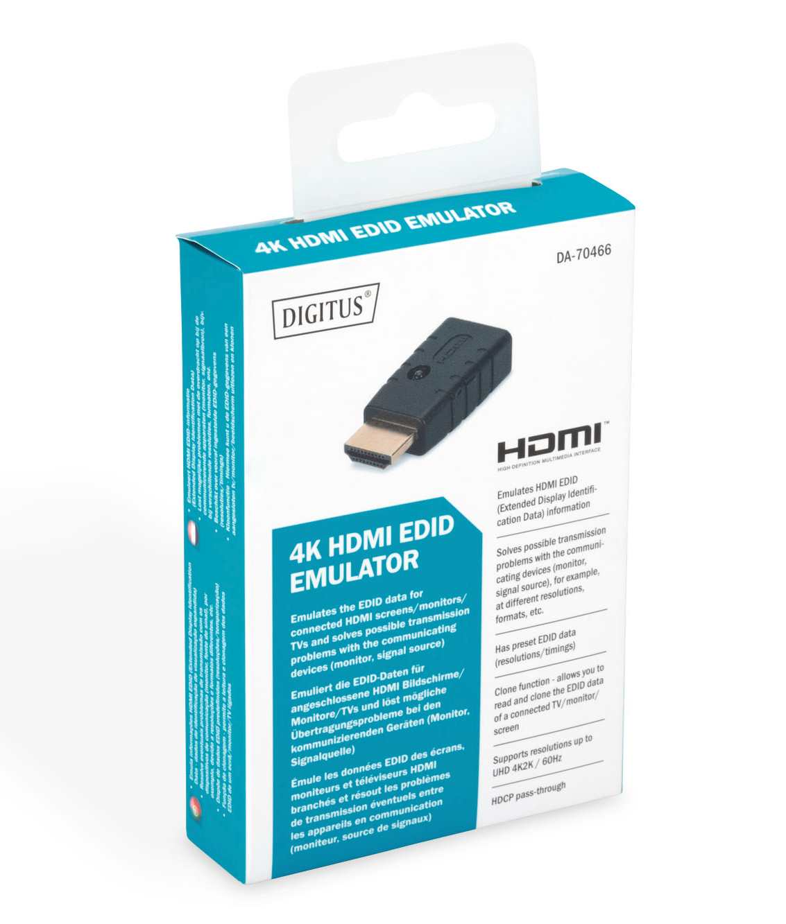 Digitus 4K HDMI EDID Emulátor nepřetržitě emuluje připojený monitor HDMI, takže zdroj signálu nezmění ani neodpojí váš signál i při přerušení spojení. Má přednastavená data EDID (rozlišení / časování), která se nachází v uživatelské příručce. Pokud chybí data EDID jednotlivých monitorů / displejů, je možné je rychle a snadno číst a klonovat pomocí funkce praktického klonu. Emulátor podporuje rozlišení až do UHD 4K2K / 60 Hz. Emulátor nabízí ideální řešení pro aplikace s extendery HDMI, rozbočovači, přepínači nebo převodníky.