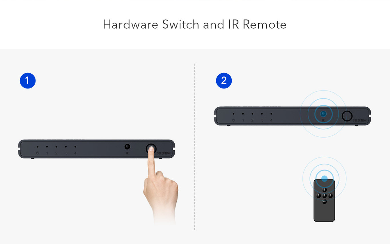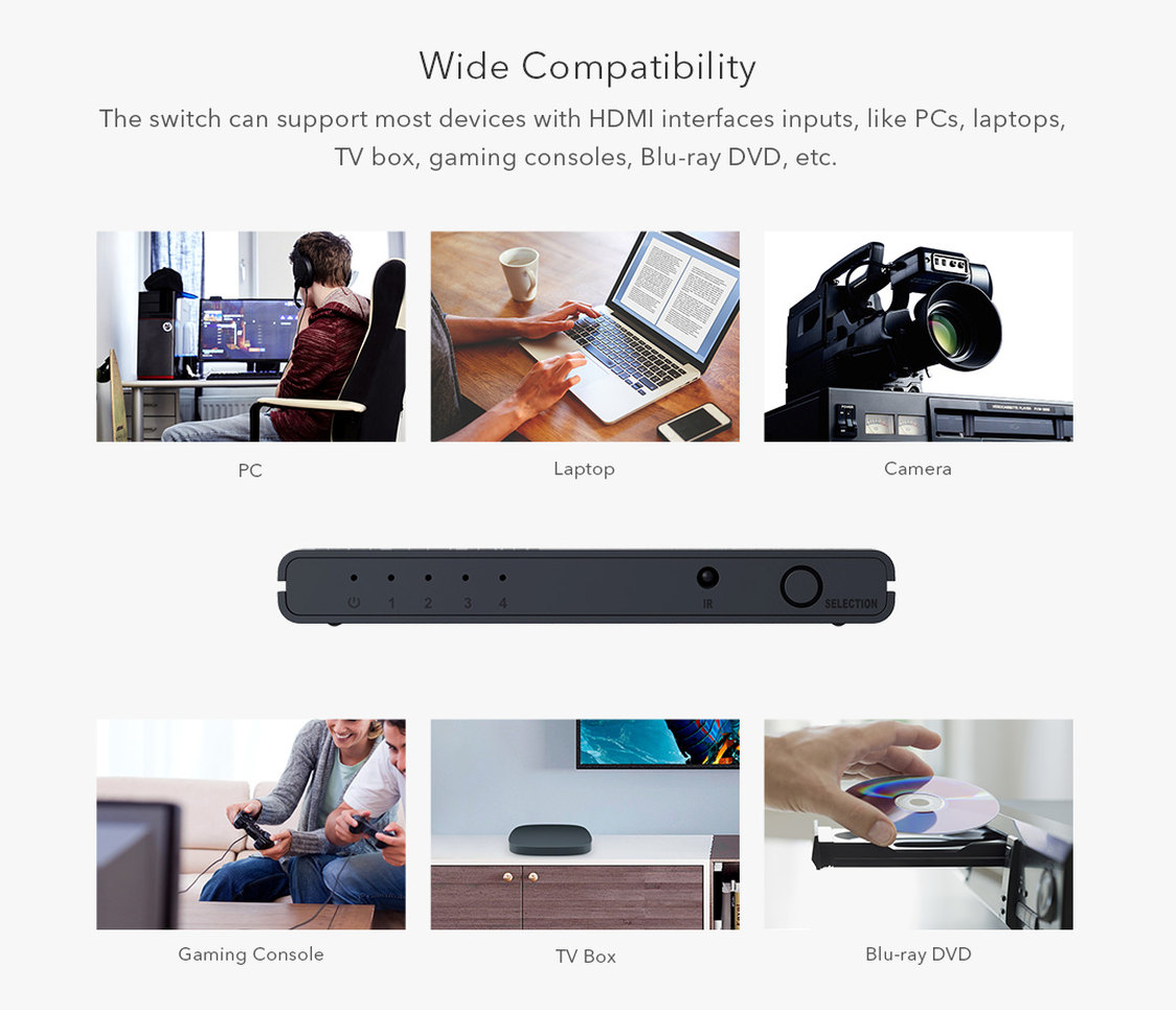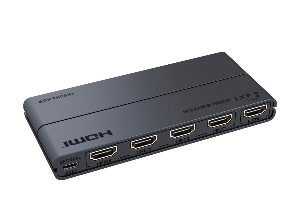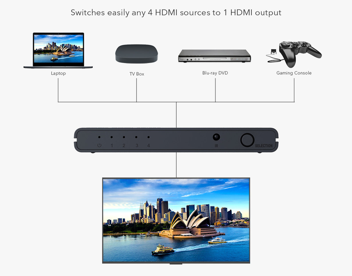4 HDMI zařízení sdílí 1 HDMI výstupní zařízení (obrazovku). Výběr zařízení tlačítkem nebo dálkovým ovládáním.